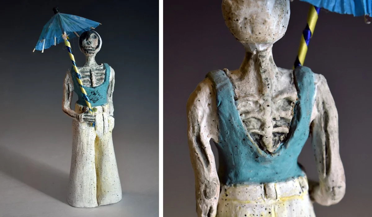 Artist Esmeralda Rodriguez Eguia (b. 1988, Roma, Texas) had always admired Catrina figures, and dreamed of having a large collection of her own one day. The idea to create her very own flamboyant skeletons hit her recently at Lincoln Square Potter Studio - Learning Center. She started utilizing the stoneware to delicately compose (etch, carve and slab build) each piece.
